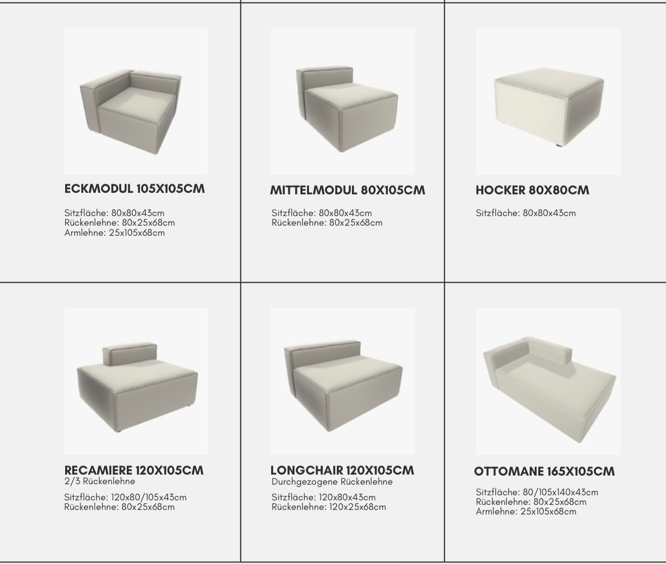 Kombiniere dein Sofa. Unkomplizierte einfache Zusammenstellung. Auf Wunsch ist auch eine Größen Änderung der einzelnen Module möglich. Für eine Sonderanfertigung kontaktiere bitte unseren Kundenservice.
